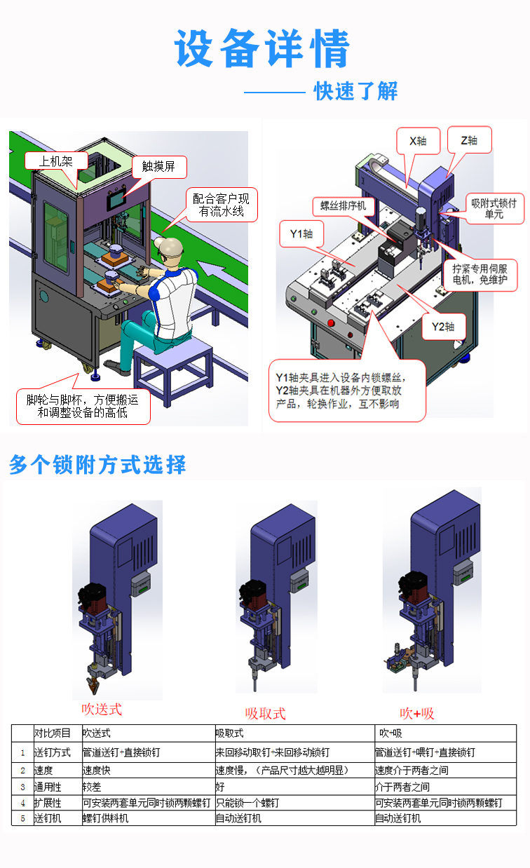 機械人自動鎖螺絲機,鎖付產品可機械手或坐標龍門式結構,鎖付工作支持yz多種結合;支持前放前取,前放后取;平均1.5-2.0秒/顆螺,速度穩定