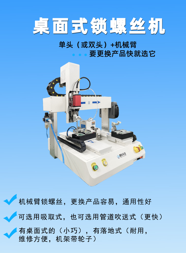 桌面型自動鎖螺絲機,主打是小規(guī)模半自動生產(chǎn)線。具有小型輕巧,可雙Y軸同步交替作業(yè),提升生產(chǎn)效率;螺絲通用性好,通過更換螺絲送釘機或螺絲盒可實現(xiàn)通用M1.0~M4的螺絲,適合